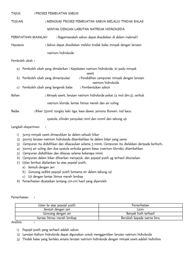 Eksperimen pembuatan sabun melalui proses saponifikasi. Bab 2 Nutrisi Dan Teknologi Makanan. Bab 4 Kadar Tindak Balas.
